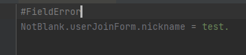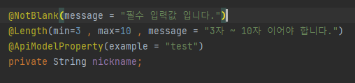 아래와 같이 "nickname"필드에 대해서 "NotBlank,Lengh" valid를 걸어두었는데