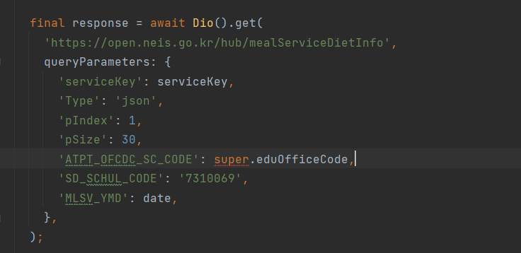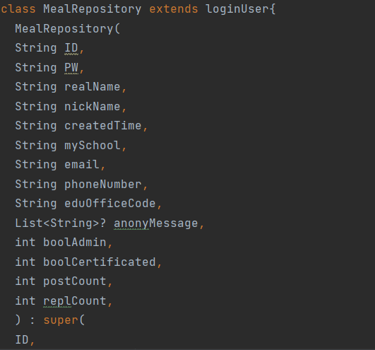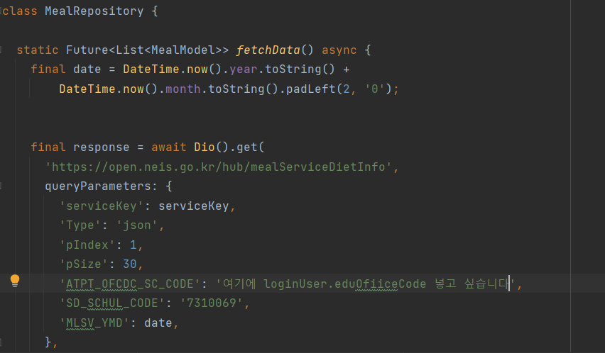 loginUser 클래스의 eduOfficeCode 값을 MealRepository에서 쓰고 싶습니다. 위젯에서 loginUser 값 쓰는 법은 알겠는데 class에서 쓰는 법은 모르겠습니다 ㅜ 알려주시면 감사하겠습니다.