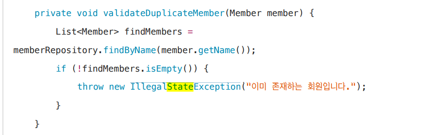 중복검사시 IllegalStateException("이미 존재하는 회원입니다.")로 예외를 발생하도록 강사님께서 로직을 작성하셨습니다.