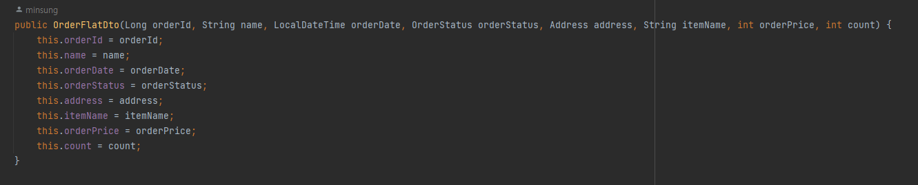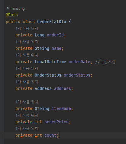 그리고 수업 시간에 배운 orderDto의 필드는 저렇습니다.