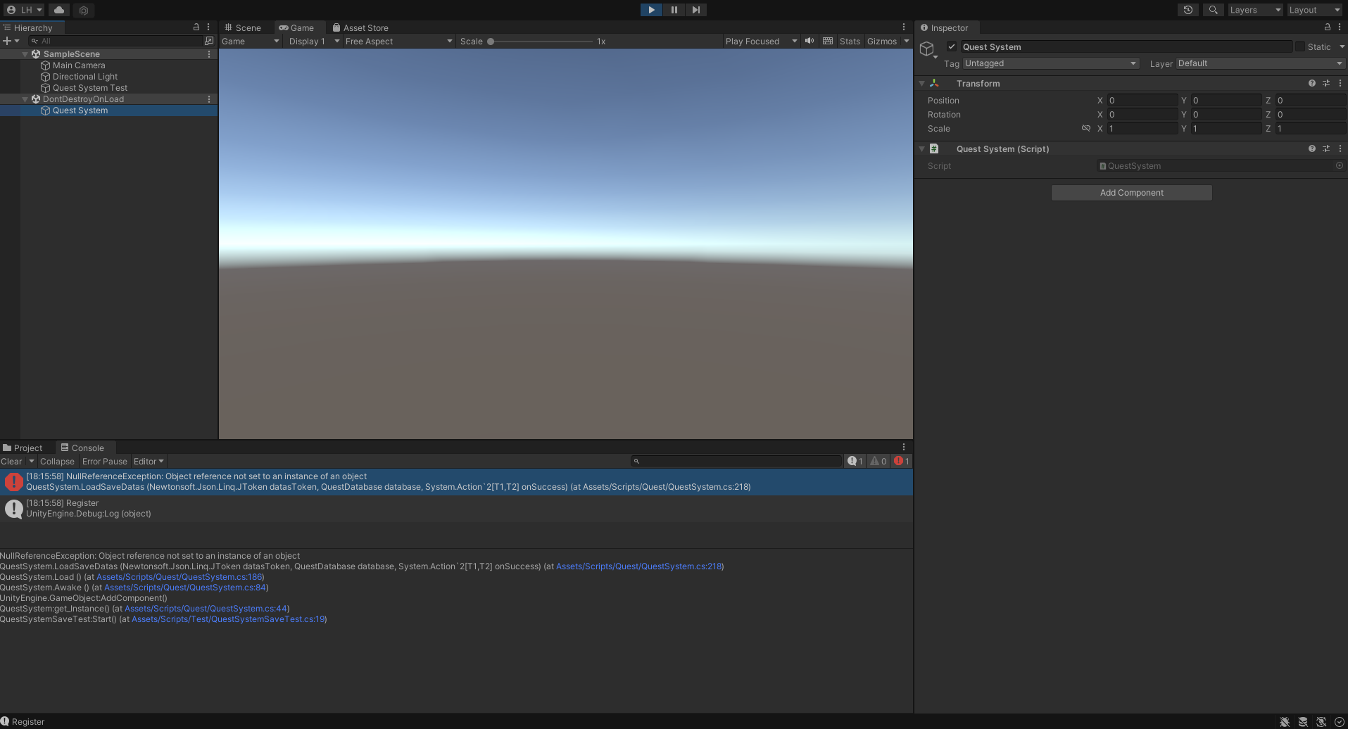 현재 에러를 보면 QuestSystem의 LoadSaveDatas 함수에서 null 에러가 생긴다는걸 알 수 있습니다. LoadSaveDatas의 어느 부분에서 에러가 나는건지(QuestSystem의 218번줄) 정확히 찾아가봐야 알 수 있겠으나, 현재 가장 가능성이 높은건 database가 제대로 Load되지 않아서 null인 상황입니다. Awake의 Resources.Load 부분에서 Database의 이름에 오타가 없는지, Database가 Resources 폴더에 정상적으로 만들어져있는지 확인해보셔야할 것 같습니다. 모든게 정상이라면 에러가 일어나는 QuestSystem의 218번 줄의 코드를 스샷으로 올려주시면 빠르게 답변을 드리겠습니다.