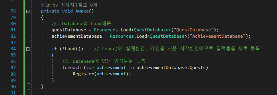 아래캡처는 오류 부분 더블클릭시 이동되어진 코드부분입니다. (QuestSystem.cs)
