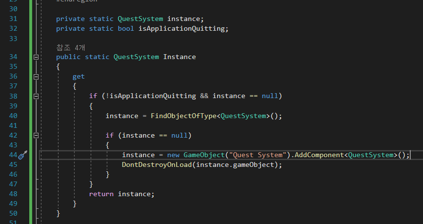 질문드리고 싶은 부분은 QuestSystem 기능 입니다. QustSystem.cs 의 instance 에서 NullReferenceException 오류가 발생하고 있습니다.