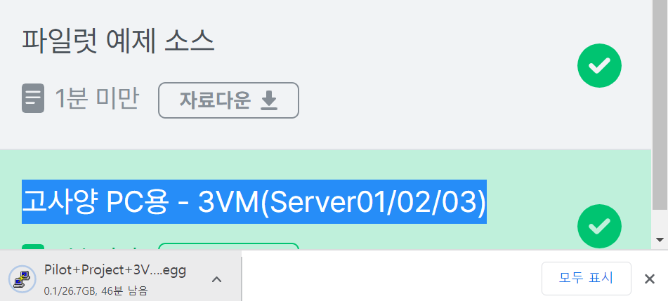 server01,server02는 잘 받아지던데 고사양 PC용 - 3VM(Server01/02/03) 파일은다운로드 받는데 1시간이 걸리고 계속 취소됨으로 나타나서 오류가 나네요 아까 미완성으로 한 번 열렸을때 putty로 잘못 들어가서 계속 이렇게 받아지는데 어떻게 하나요, 다시 연결프로그램을 버츄얼박스로 지정하면 이렇게 나옵니다