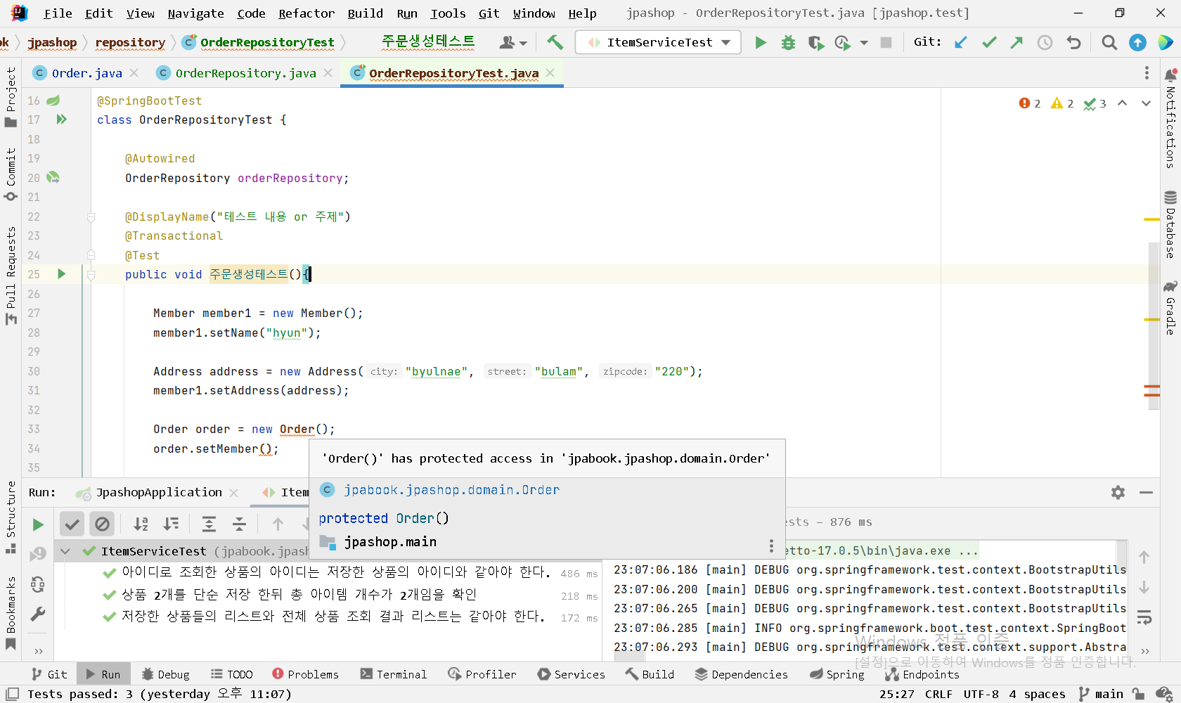 주문 도메인에 protected 로 되어 있다는데 왜 이렇게 되어 있는거죠? 레포지터리를 직접 테스트하면 안된다는 건가요?