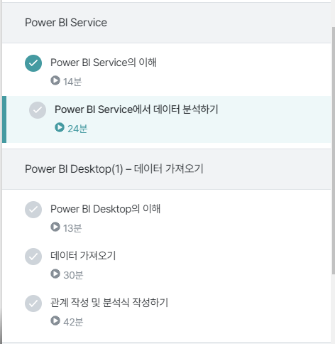 첫 번째 학습 영상인 [섹션0. 오리엔테이션]의 [Power BI 기본 과정 소개] 화면 오른쪽 상단에 샘플 및 교안을 다운로드할 수 있는 [수업자료] 아이콘이 있습니다.