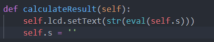 해당 코드를 보시면 연산 결과값을 lcd전광판에 먼저 보여주고 self.s 라는 변수를 다시  '  ' 로 초기화 하였기에  해당 동작이 실행되지 않습니다.