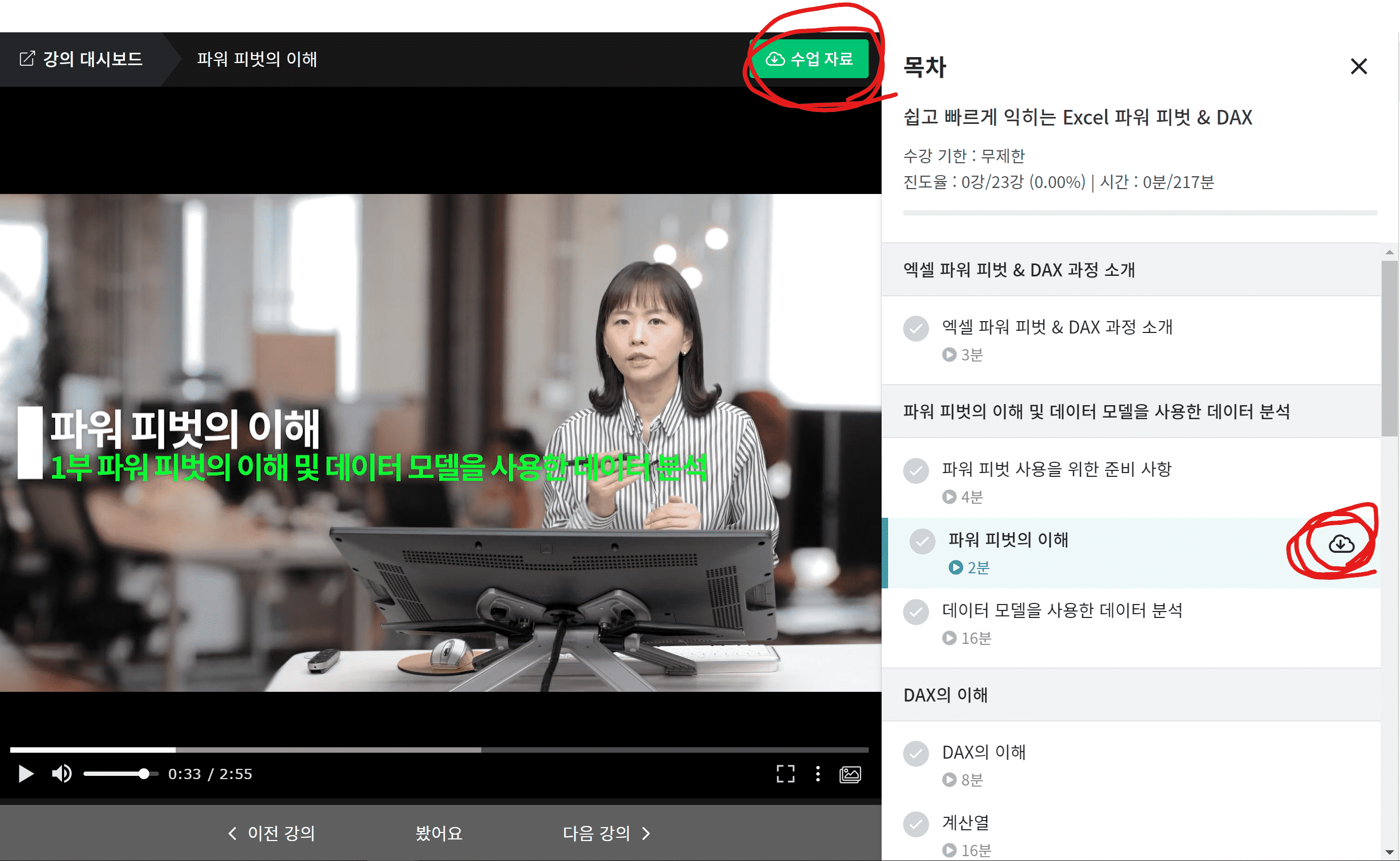 교안과 예제파일은 '섹션 1 파워 피벗의 이해 및 데이터 모델을 사용한 데이터 분석'의 두번째 강의인 '파워 피벗의 이해' 강의에 첨부되어 있습니다. 아래 캡쳐화면에서 빨간 동그라미 친 부분에서 다운로드 가능합니다.