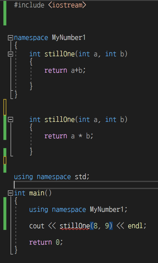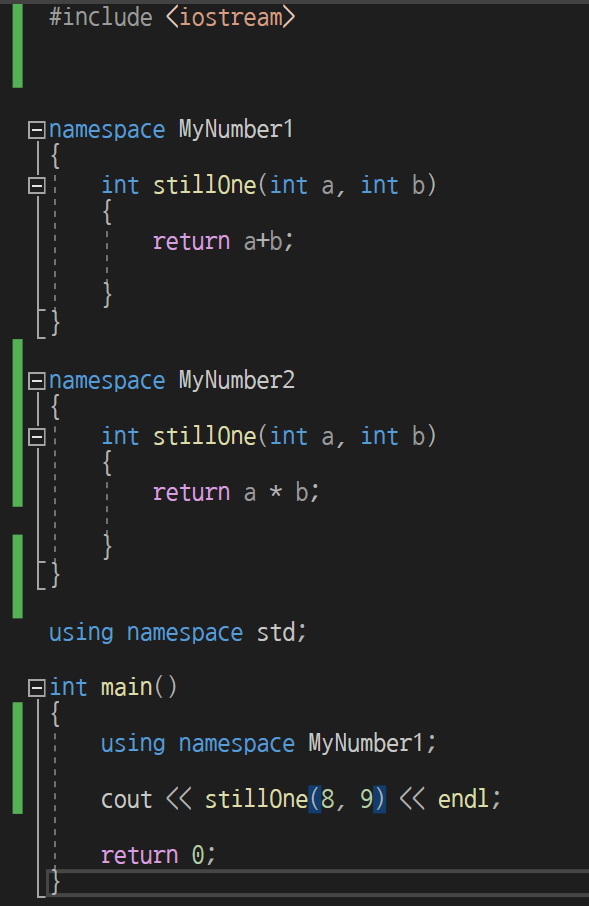 MyNumber2라는 namespace를 없애면 main함수에서 using namespace MyNumber1;을 해도 stillOne이 중복된다고 뜹니다. 왜 이런 건지 알 수 있을까요?