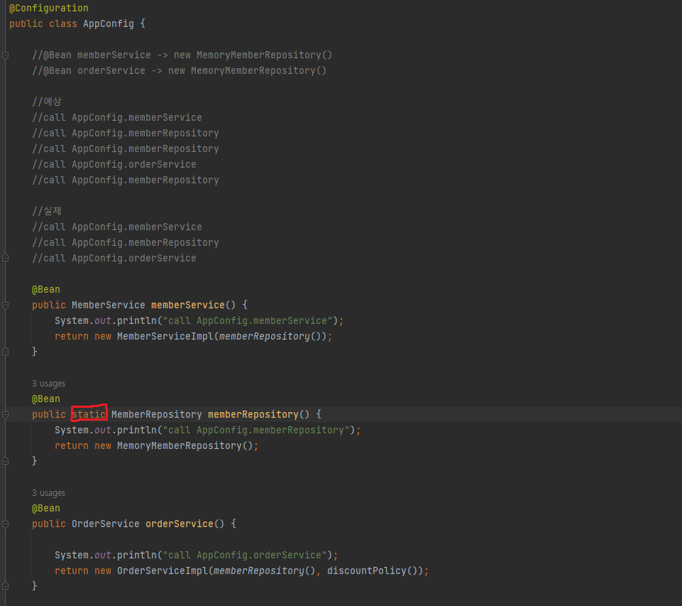 수업과 관계없는 질문입니다 ㅠㅠ. AppConfig 클래스에서 memberRepository를 반환하는 메서드에 public만 붙였을때는 정상적으로 싱글톤 빈으로 등록되어 정상 작동하다가 public static이라 붙였더니 싱글톤이 깨져버렸습니다. AppConfig는 CGLIB 라이브러리를 사용해 만든 것인데 AppConfig@CGLIB의 실제 구체적인 코드에서 싱글톤 빈으로 등록하지 못하고 AppConfig 기존 자바 로직을 호출함으로 발생하는 것인가요??