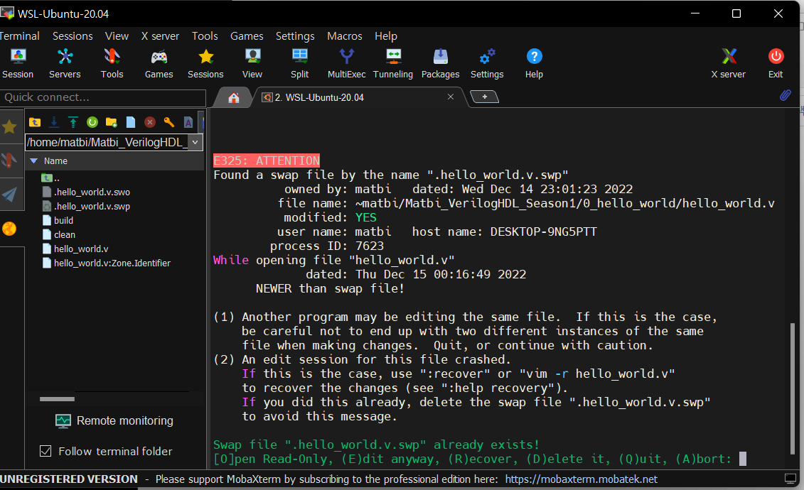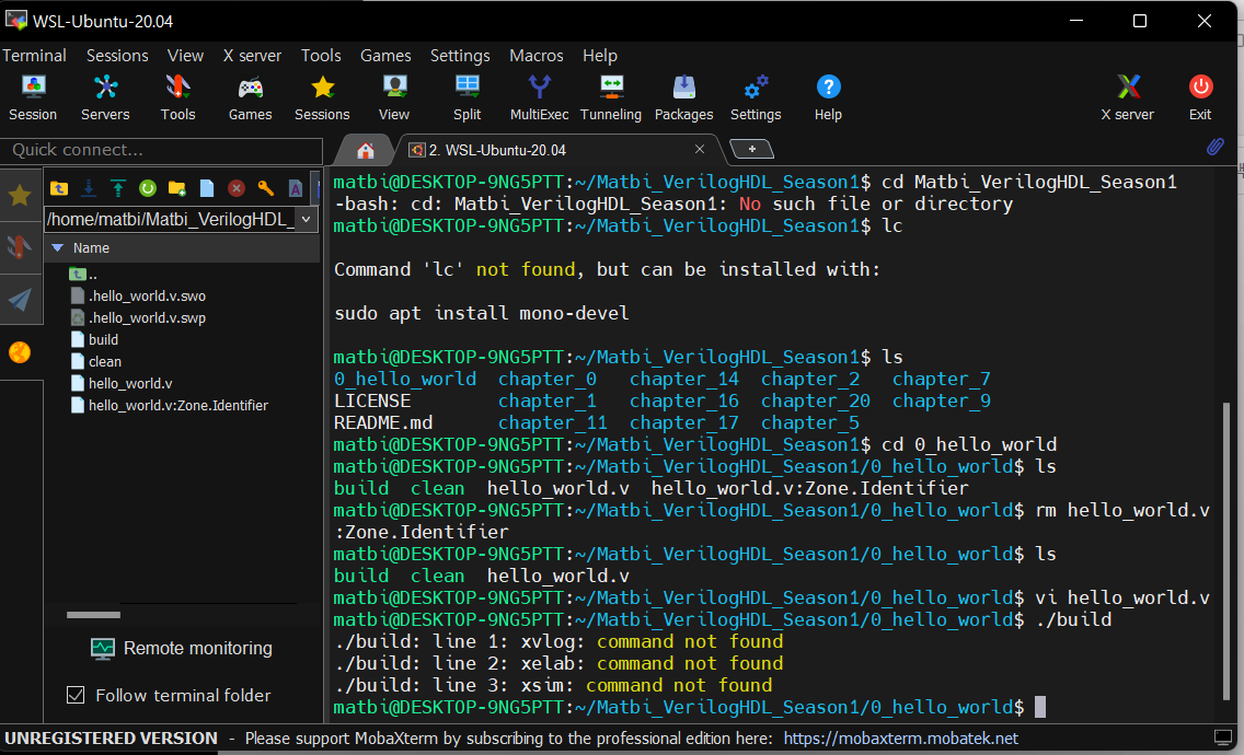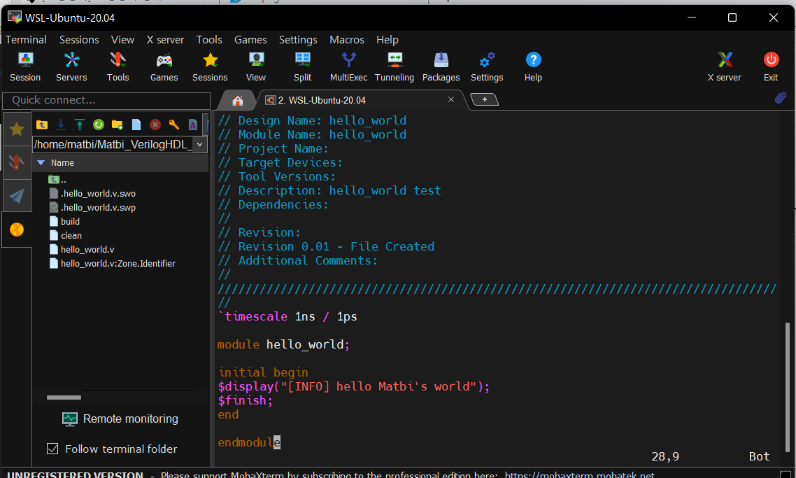 물결이 나오고 밑에 “hello_world.v” 1L,1C 라는 것이 뜹니다.(강의상에서와 달리 코딩할수 있는 부분이 안나옵니다.)