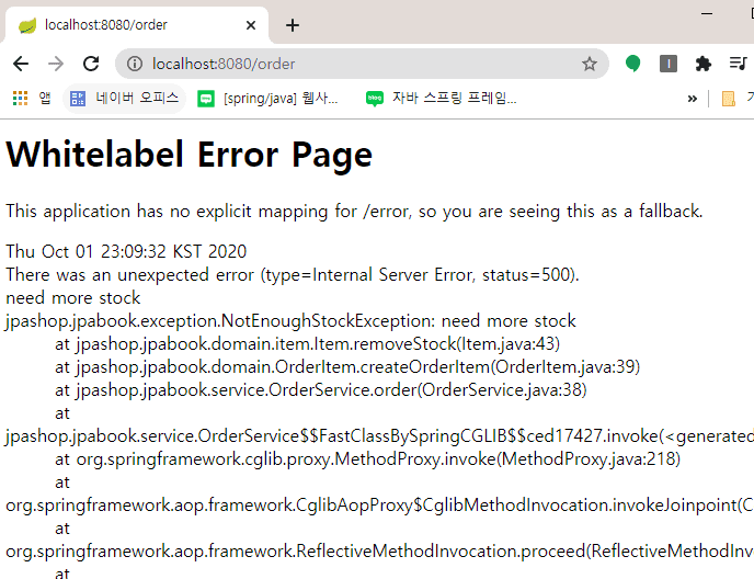 2020-10-01 23:09:32.109 ERROR 9752 --- [nio-8080-exec-7] o.a.c.c.C.[.[.[/].[dispatcherServlet] : Servlet.service() for servlet [dispatcherServlet] in context with path [] threw exception [Request processing failed; nested exception is jpashop.jpabook.exception.NotEnoughStockException: need more stock] with root cause