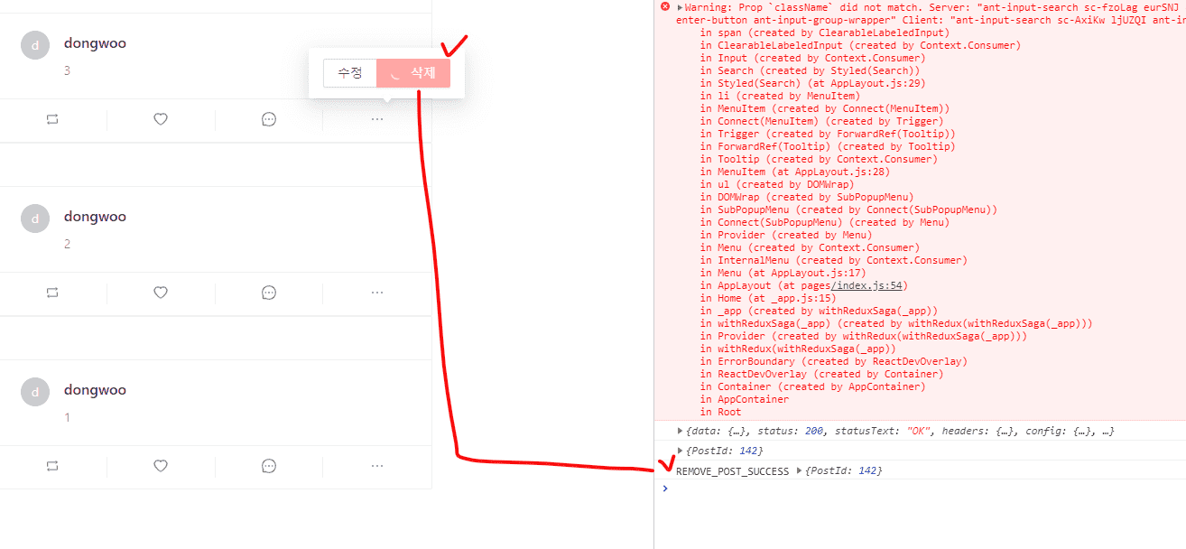 잘 삭제 됩니다. 근데 한번씩 REMOVE_POST_REQUSET에서 리덕스가 멈추고 위의 오류가 뜹니다. 디비에서는 잘지워져있구요. 혹시 reducers에서 filter을 이용해서 그런가 싶어서 splice로 바꿔주었습니다. 맞는진 모르겠지만 잘 지워지고 네트워크 오류도 없습니다. 근데 아주가끔 한번씩 저위에 오류가 계속 발생되는데 어떤 오류인가요?