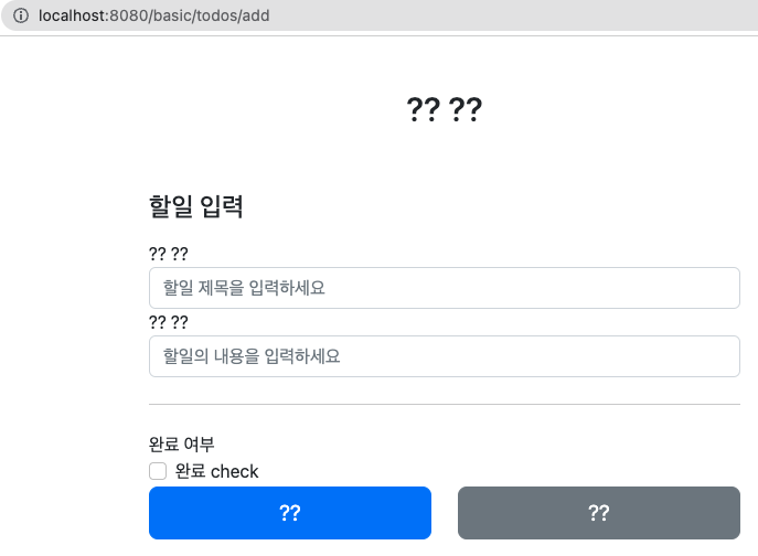 웹 애플리케이션에 메시지 적용하기 - addForm.html에 메시지를 적용시켰는데 아래와 같이 한글이 깨져서 나옵니다. (수업에서의 item을 저는 할일(todo)로 바꿔 공부하고 있습니다)