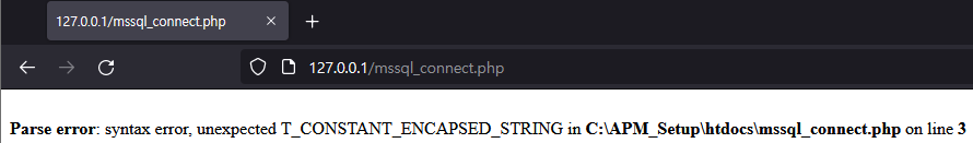 Parse error: syntax error, unexpected T_CONSTANT_ENCAPSED_STRING in C:\APM_Setup\htdocs\mssql_connect.php on line 3