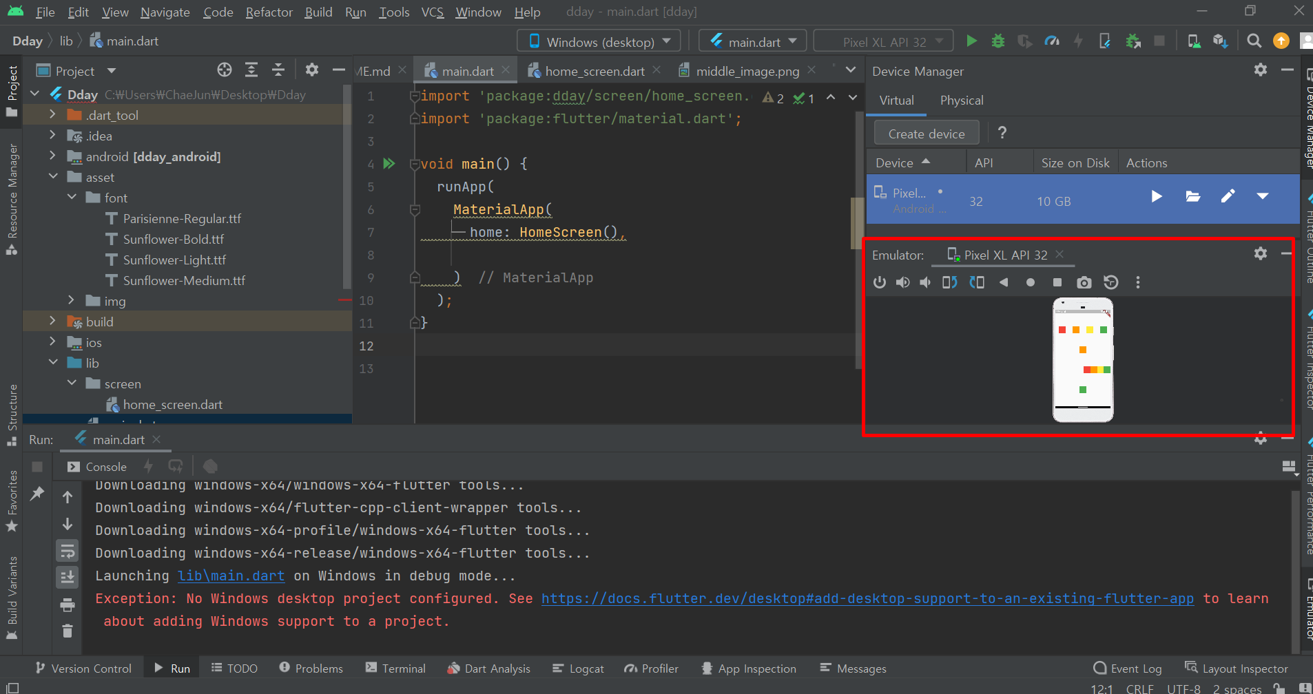 화면 상단에 실행할 기기를 선택하는 옵션을 보시면 Windows로 현재 선택돼계십니다. [Windows(desktop)]