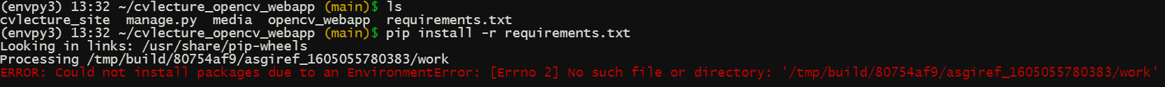 ls 를 하면 requirements.txt가 존재하는데 pip install -r requirements.txt 를 하면 No such file or directory error가 뜹니다.. 분명 requirements.txt 파일이 있는 폴더로 이동했는데 왜 파일을 찾을 수 없다는 에러가 뜨는지 모르겠습니다. 해결책을 알 수 있을까요?