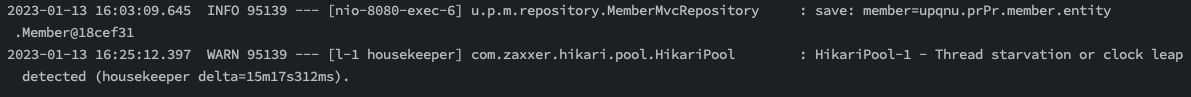 딱 회원가입까지만 코드로 작성한 후, 실행해보았는데 - 회원가입은 잘 되었지만 콘솔창에 위와 같이 2개의 메시지가 나와 있습니다.