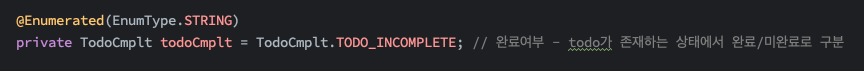 (이 화면캡처는 Todo.class (할일 엔티티)에서 완료 여부를 나타내는 todoCmplt 의 코드입니다.) 추정까지는 했지만 더 이상은 진전이 없어 문의드립니다.