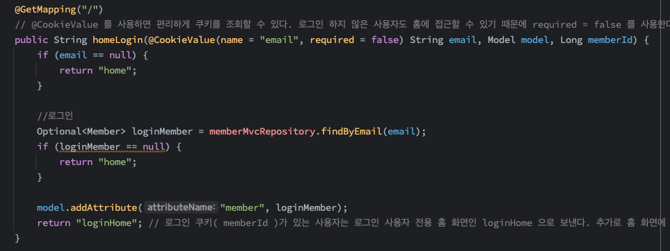 homeLogin메서드의 매개변수를 3개로 하였습니다. 제가 짠 코드에서는 (memberId가 존재는 하지만) 실제 로그인id 역할을 하는 것은 email이기 때문입니다. memberMvcRepository.findByEmail은 아래와 같습니다.