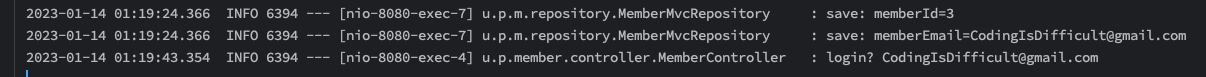 위 화면캡처에서 위에 2줄은 회원가입 시 로그가 출력된 것이고, 3번째 줄은 로그인 후 ID가 출력된 것입니다. (강의에서의 로그를 약간 수정했습니다.)