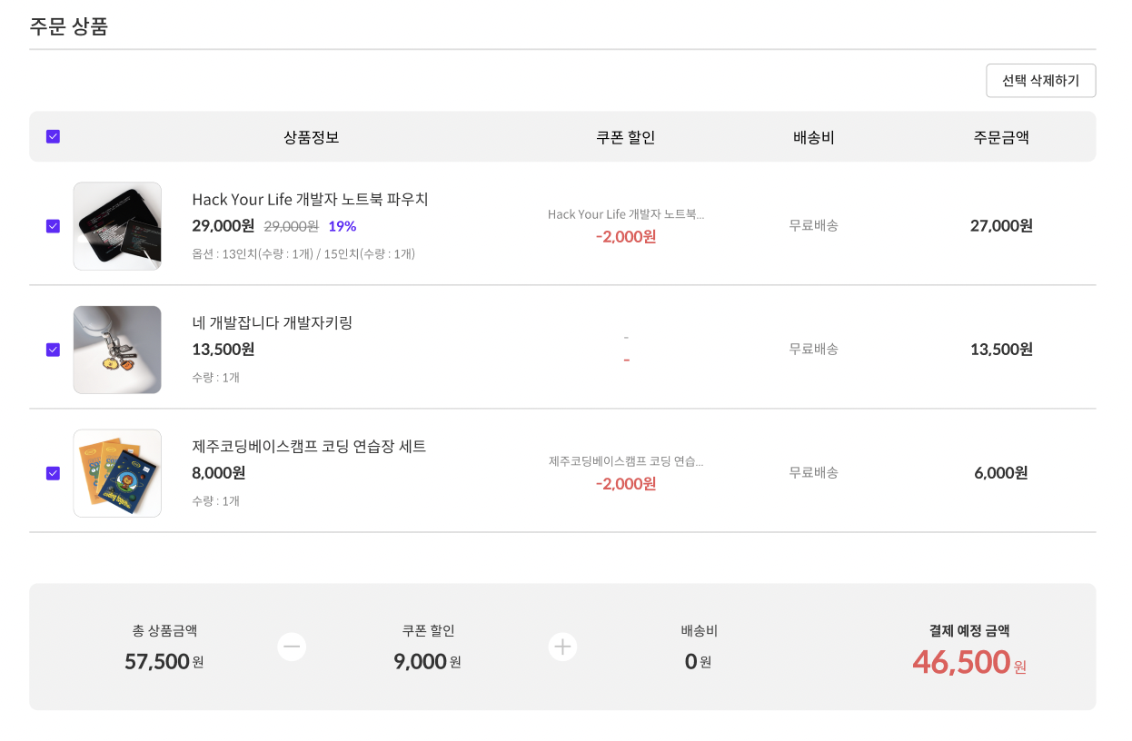 또한, 총 상품금액을 나타내는 박스에서도 마찬가지로 쿠폰 할인은 상품 가격 할인 쿠폰이 적용되고, 배송비는 선택한 전체 상품의 배송비로 무료 배송 쿠폰을 사용하면 금액이 반영되어 나타나야 합니다.