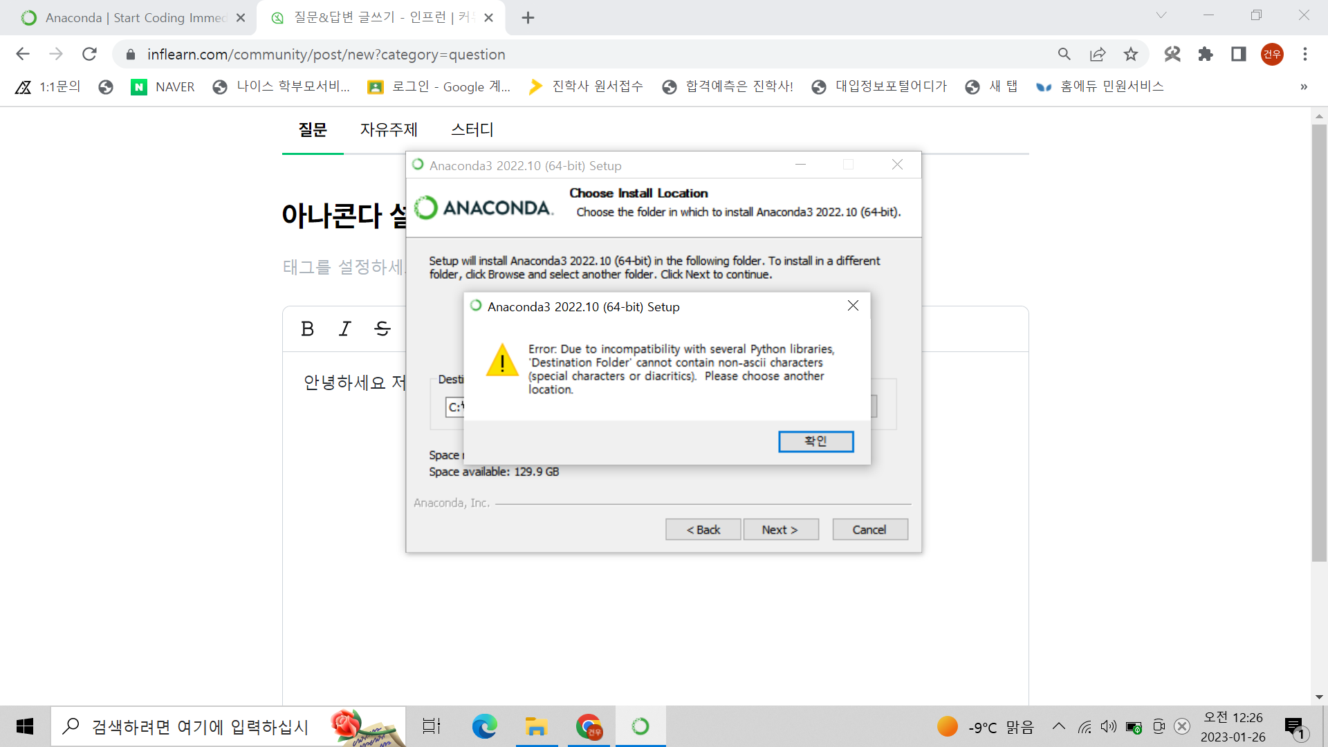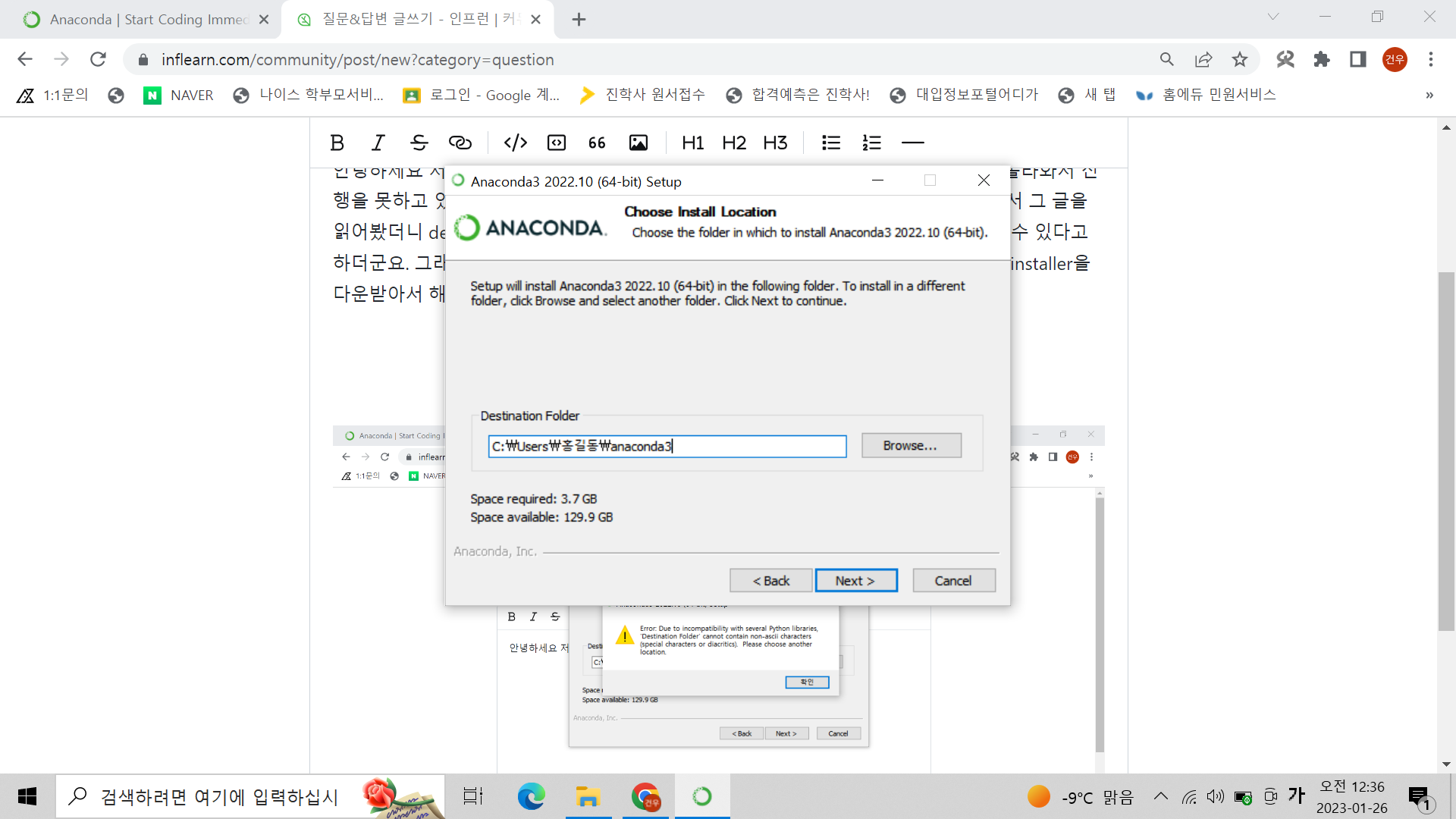 안녕하세요 저는 윈도우 10에 아나콘다를 설치하려고 하는데 자꾸만 이런 메세지가 올라와서 진행을 못하고 있었습니다. 그런데 질문게시판에 같은 문제로 질문을 하신 분이 있으셔서 그 글을 읽어봤더니 destination folder 이름에 한글이 포함되어 있으면 이런 메세지가 올라올 수 있다고 하더군요. 그래서 저도 폴더 이름을 영문으로 고치고 컴퓨터를 재부팅했더니 폴더 이름은 영어로 바뀌었는데 아래 그림처럼 아나콘다 destination folder 이름이 여전히 안 바뀐 채로 있어서 next 클릭해도 같은 메세지가 뜨네요
