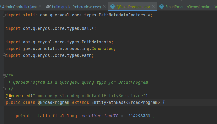 그래서 Q파일.java를 확인해보니 아래와 같이 javax를 기반으로 @Generated 어노테이션이 생성된 것을 확인했습니다.