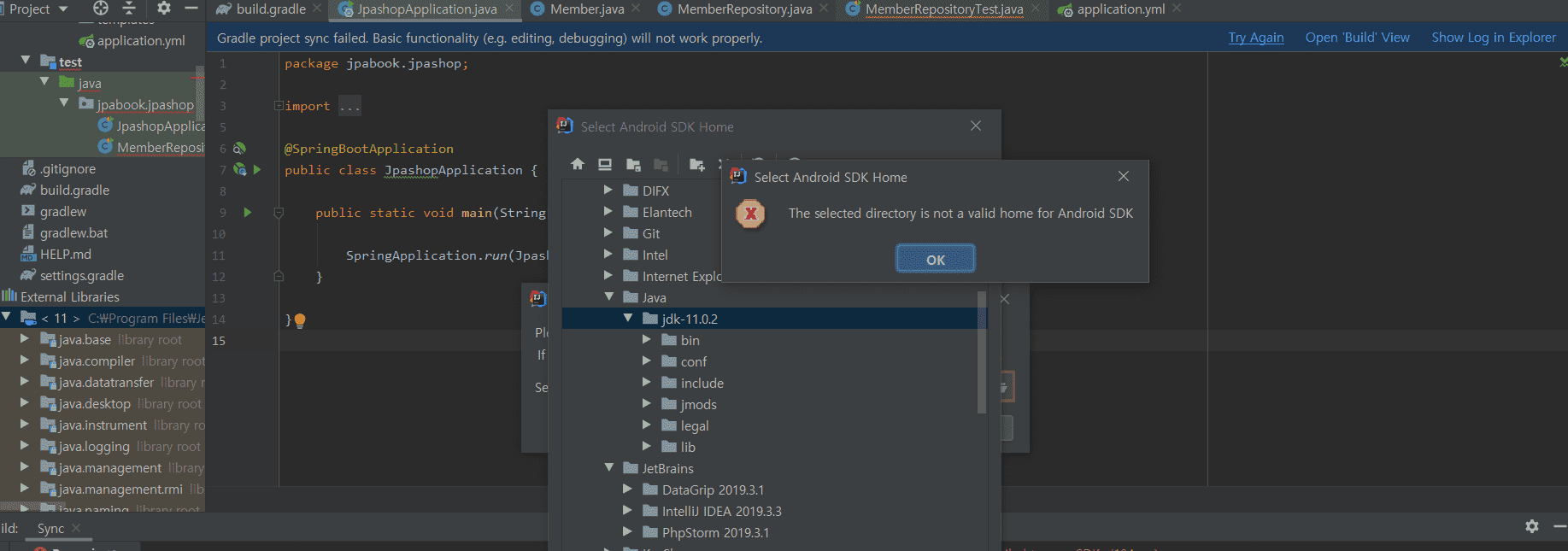 JDK를 설정해야 하는데 안드로이드 설정이 뜬게 문제로 보입니다. 이 부분을 다시 확인해보시겠어요?