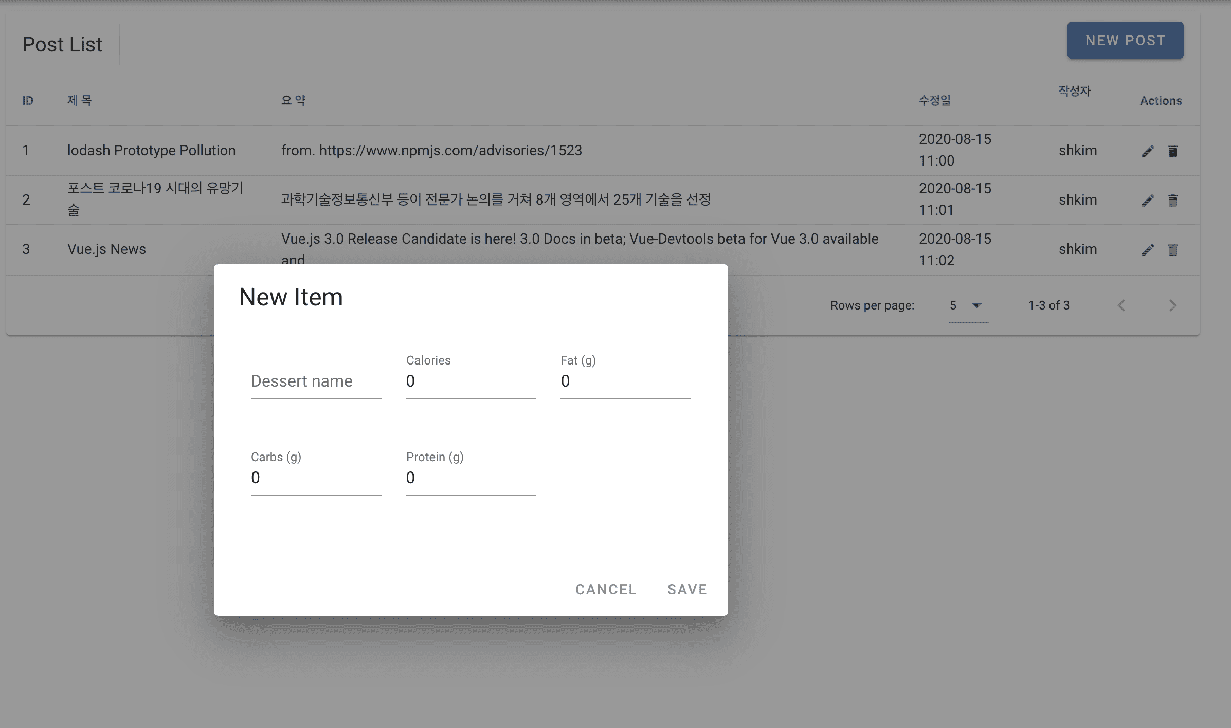 추가로, Actions 컬럼의 edit 아이콘 클릭 시, 위의 화면이 잠깐 나왔다가, 게시글 쓰는 양식이 출력됩니다.