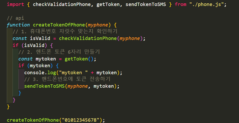 각각 checkValidationPhone(), getToken(), sendTokenToSMS() 함수를 불러주는 3가지 역할을 하고 있는 것 같은데