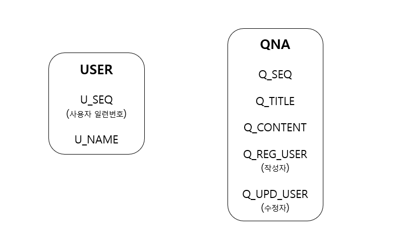 QNA 테이블에 존재하는 Q_REG_USER , Q_UPD_USER 는 USER.U_SEQ 이다.