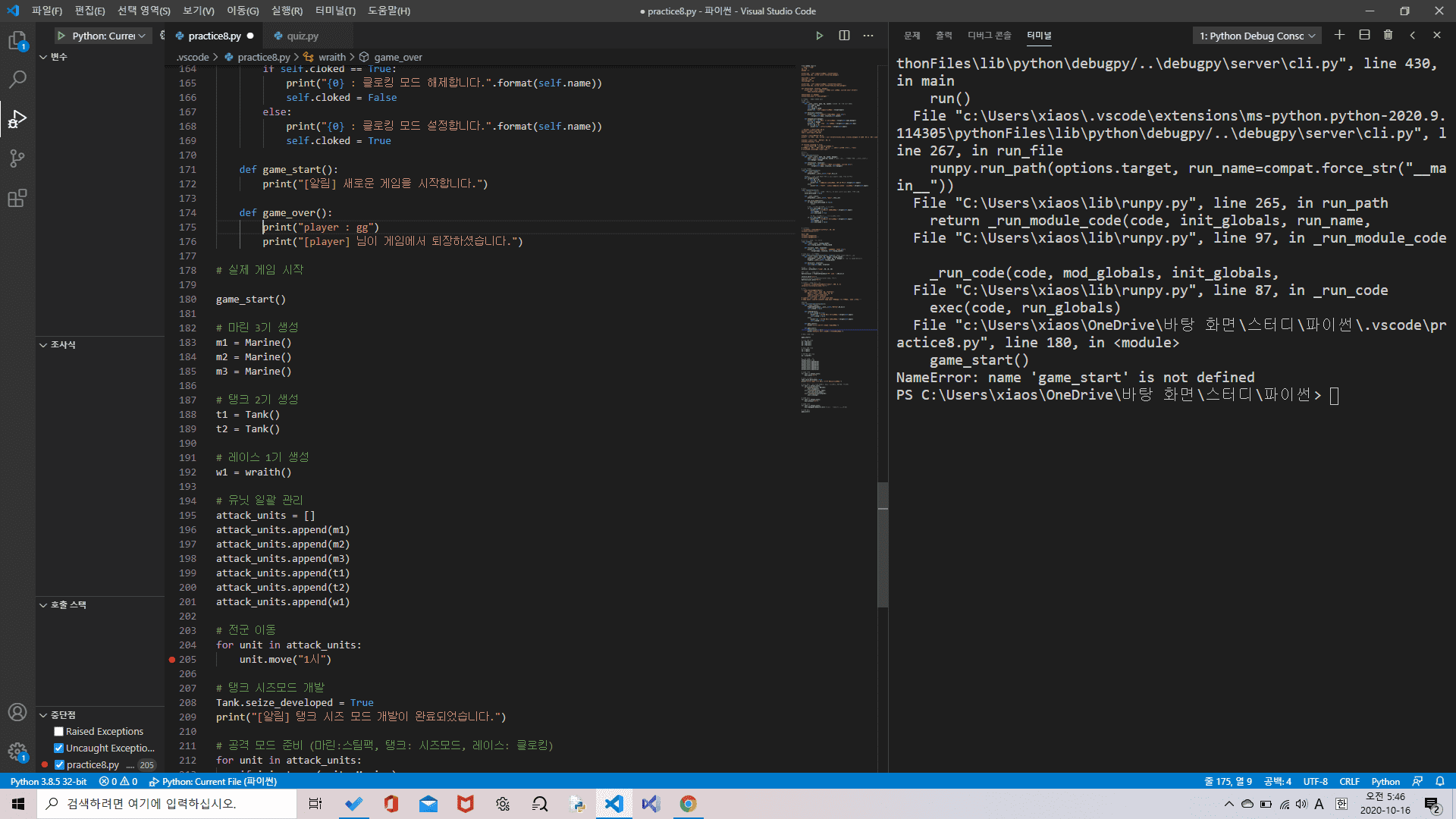 game_start 와 game_over 함수가 들여쓰기가 돼있어서 클래스 메소드로 돼버렸네요. 영역 선택 하시고 Shift + tab 을 눌러서 들여쓰기를 해제해주세요