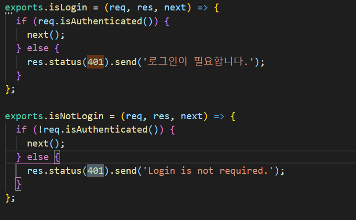 미들웨어 isLogin을 남기면 401에러가 생기고