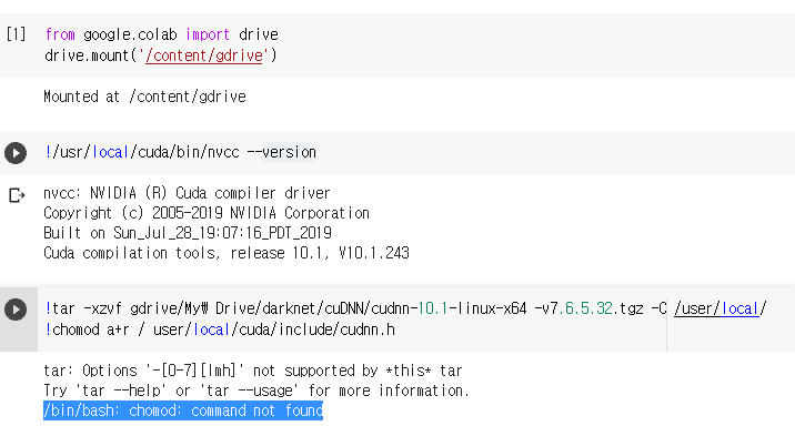 제 드라이브에서 darknet이라는 폴더를 만들고 그 안에cuDNN이라는 폴더를 만든 뒤 이 파일을 넣고 실행을 했더니 아래와 같이 'tar: Options '-[0-7][lmh]' not supported by *this* tar