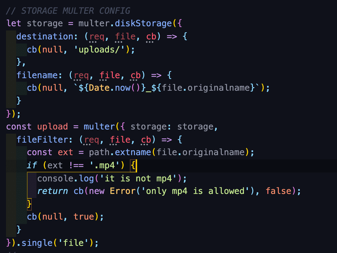 해당코드에서 fileFilter가 적용이 안되는거 같아요 동영상 업로드에서 동영상 파일이 아닌 것을 못올리게 막고싶은데 이상태로 동영상파일이 아닌것을 올리면 서버를 재시작해야하는 사태가 일어납니다