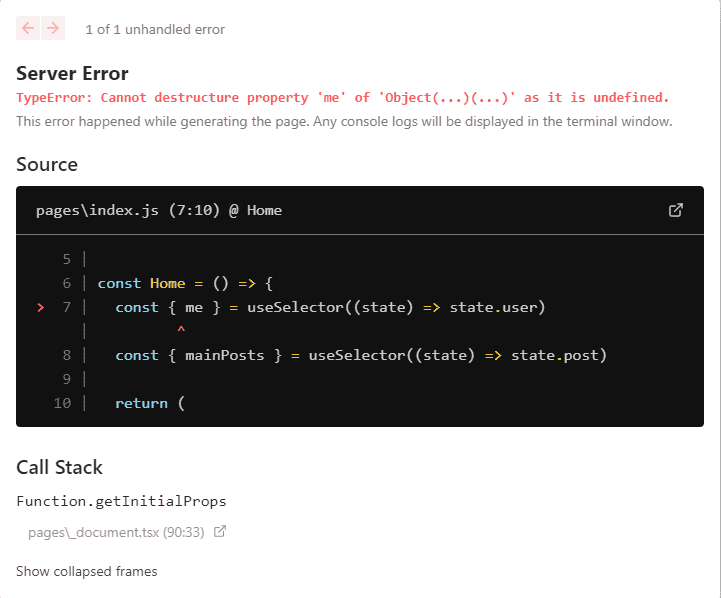store/configureStore.js에서 redux 설정을 하는데 여기가 문제일 수 있습니다.
