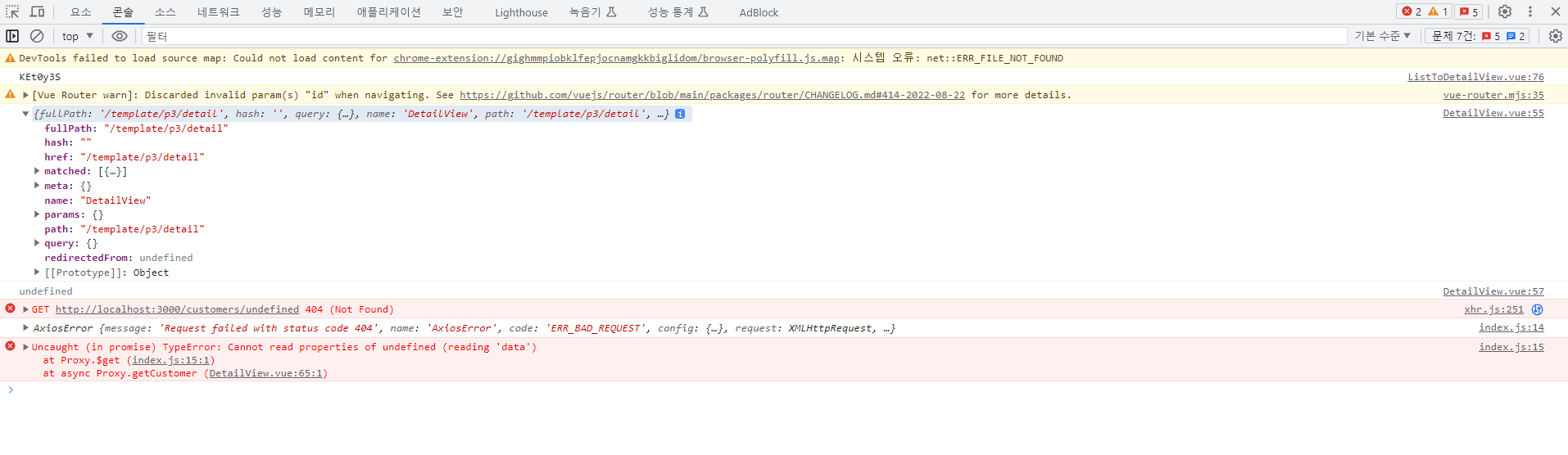 현재 log찍었을 때 router params에 id가 안들어있어서 goToDetail부분이 이상하다고 생각이드는데 혹시 몰라서 github에 있는 것을 그대로 붙여 쓰는데도 결과는 똑같더라고요 ㅠ 현재 customerId는 값이 들어오고있어요.