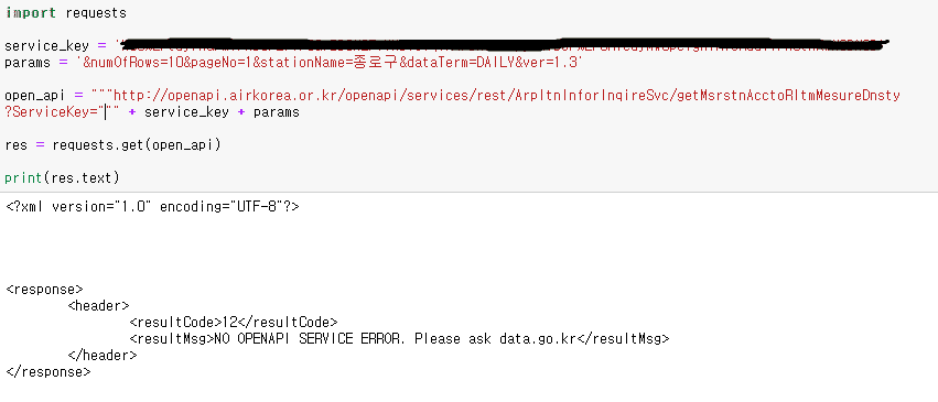 공공 API 는 각 API 마다 가끔 비정상동작을 할 수 있습니다. 이 부분은 공공API 이슈라서 정부에 묻는 수밖에 없고요. 에러를 읽어보시면 좋을 것 같습니다. 에러로도 해당 API가 없다고 data.go.kr 에 물어보라고 나오고 있고요. 만약 강의와 관련없는 API를 말씀하시는 것이라면, 이 부분은 다음 공지사항도 꼭좀 확인부탁드립니다.
