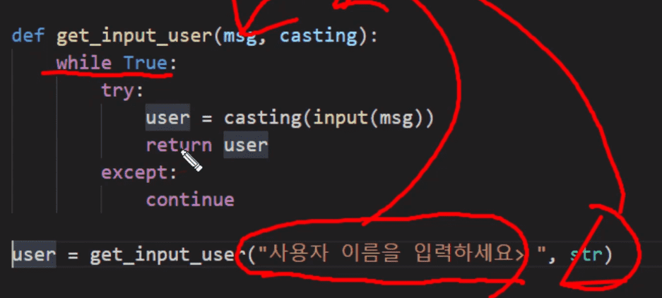 위의 이미지에서 보듯이 해당 함수는 제대로 된 값이 입력되지 않으면 바깥쪽 while 문에 의해 무한반복이 되게 설계된 구조입니다. 그래서 정확한 값이 입력되어야먄 return 되고 그렇지 않은 경우에는 반복문을 빠져나갈 조건이 없게 되어있습니다.