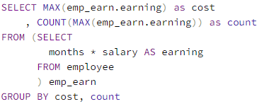 HAVING earnings = (SELECT MAX(months*salary) FROM employee)