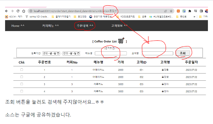 주문내역에서 고객명, 주문내역 설정하고 조회가 버틍을 눌러도 동작하지 않습니다.