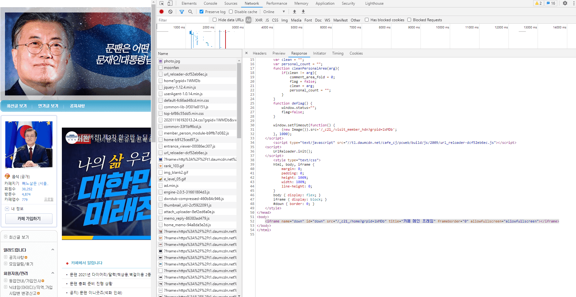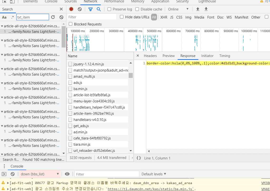 네트워크탭에서 이것저것 뒤져봐도 파일이 너무많아서 어딜 봐야할지도 모르겠고,