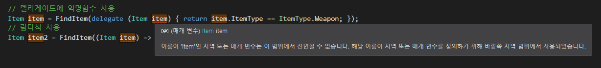 일단 delegate 안쪽 이름을 i로 이름 바꿔서 해결했습니다. 감사합니다!
