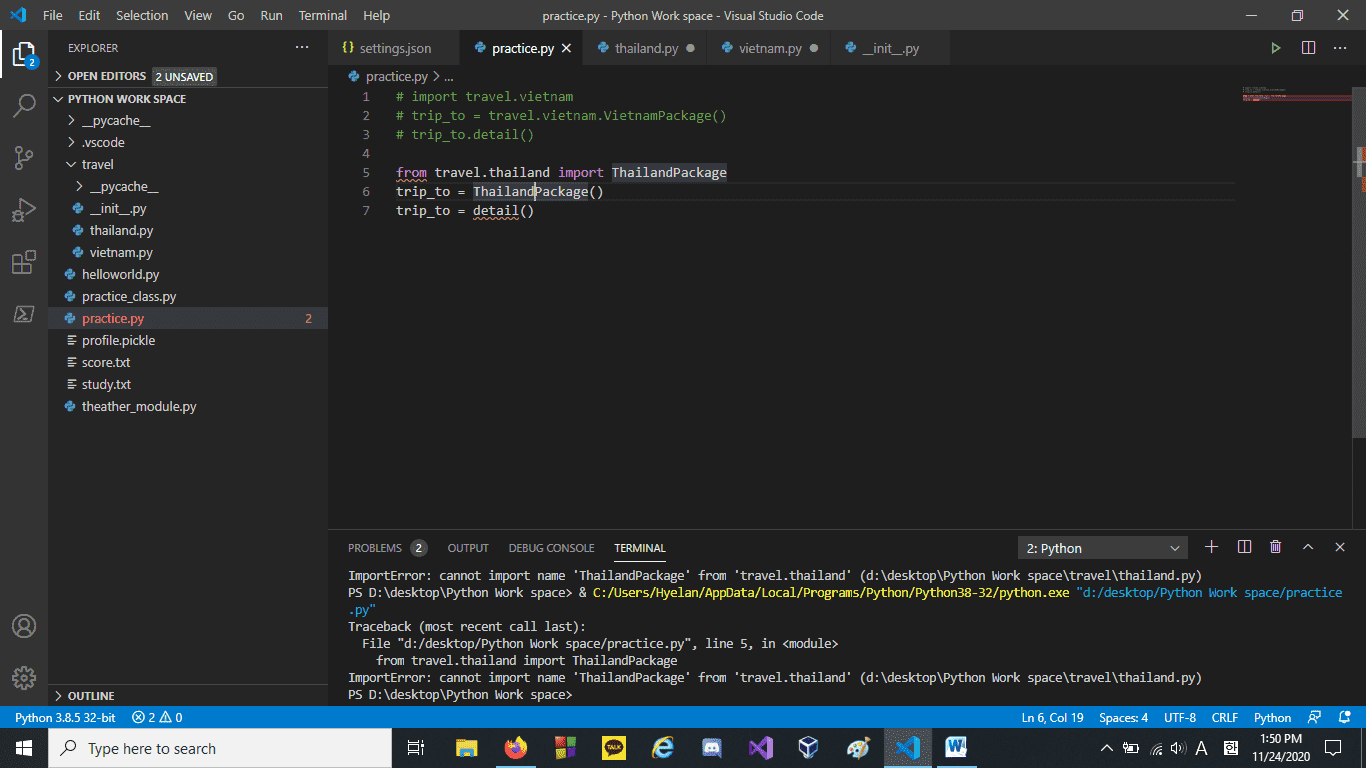 travel과 practice.py가 같은 레벨에 있습니다. ThailandPackage를 찾을 수 없나요?