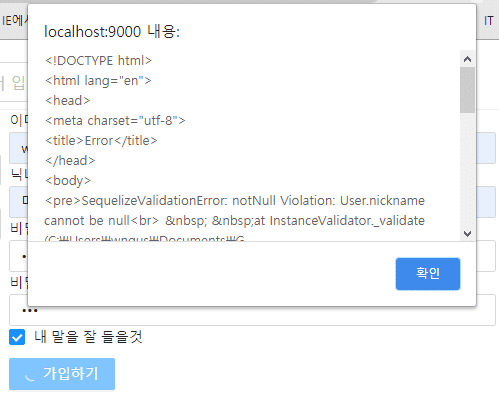 서버로 닉네임이 전달되지 않는 것 같습니다. 네트워크 탭의 request나 리덕스 데브툴의 SIGN_UP_REQUEST에 nickname이 들어서 서버로 전송되나요?