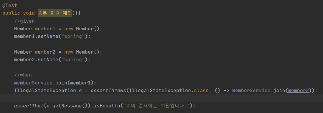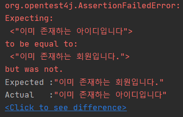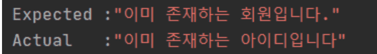 테스트 케이스에서 검증하는 오류 메시지는 "이미 존재하는 회원입니다." 인데