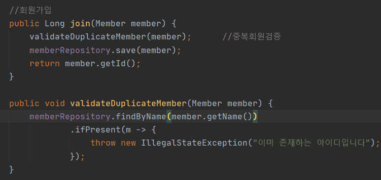 실제 validateDuplicateMember 메서드에서 발생하는 예외 메시지는 "이미 존재하는 아이디입니다."