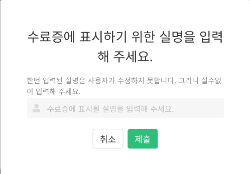 혹시 위의 사진처럼 수료증에 표시하기 위한 실명을 입력하는 창이 언제뜨는지 알 수 있을까요?