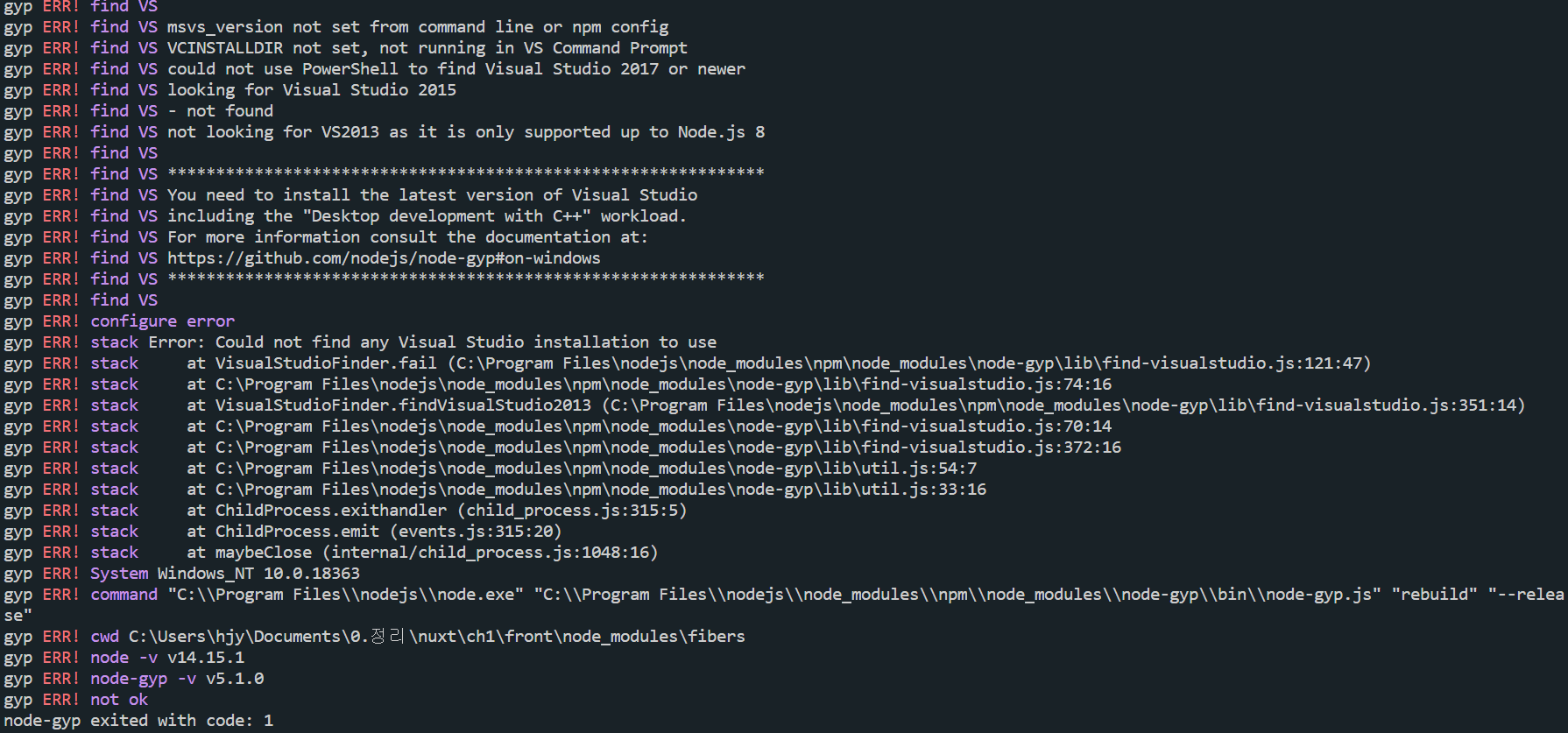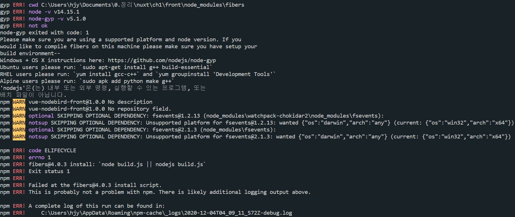 노드에 필요한 python make g++같은 툴이 윈도에 설치되어 있지 않은 것 같습니다. 보통 windows-build-tools 설치하면 같이 설치되는데요.